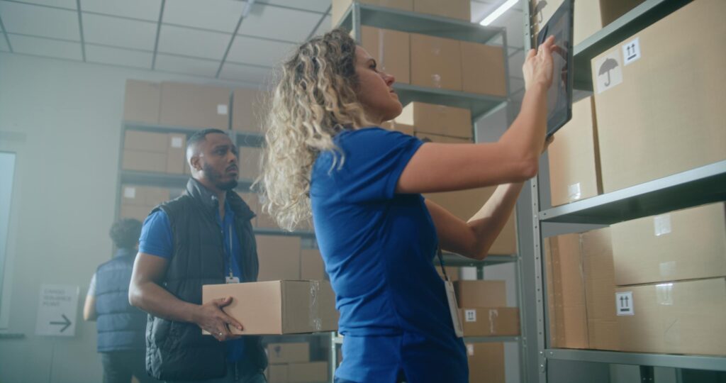 A smiling woman works on a laptop while a coworker packs boxes on shelves.